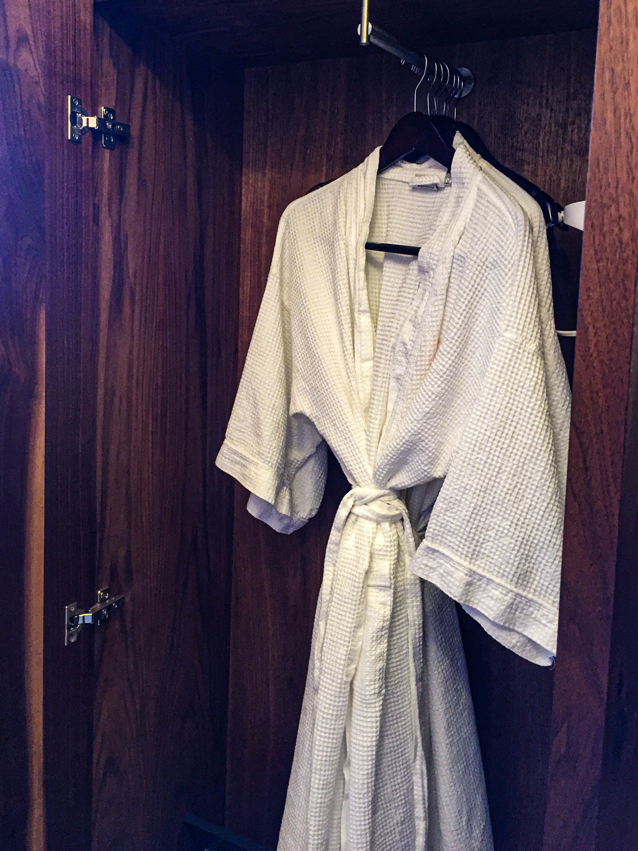 If you are a lover of pink, then this hotel is for you!!! Every bedroom is colored pink; now, if the thought of pink makes you break out in hives, don’t worry; the color is very light, almost like a blush, depending on where the light hits. The manager did say that they are opening two more Quirks in Durham and Charlotte and will not be pink!! Every room has a retro pink small igloo refrigerator, a cute small mini bar, and a pink ice bucket. The bathroom is very minimalistic, with a fantastic walk-in shower. The dresser drawers are multitasking with steps attached to look outside or take a selfie. Local artists donate all the art in the hotel, there is a full bar in the lobby, and the courtyard is lovely and peaceful if you have to study or write a paper; sorry, forever thinking about homework. The one thing that I love is the very soft robe; depending on your Hyatt membership, you can also receive slippers at check-in.