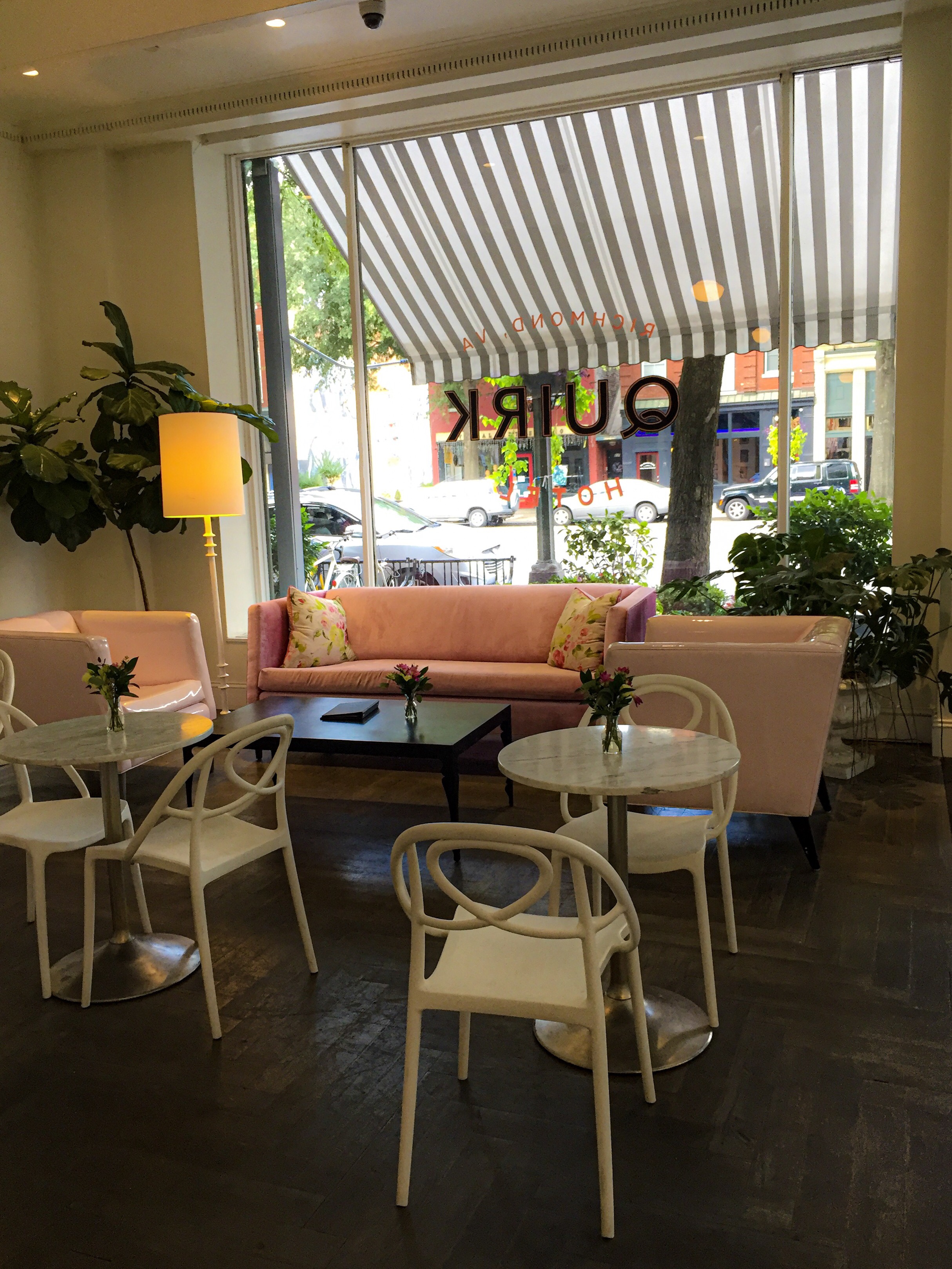Quirk Hotel lives up to its name; it would be adorable if I described it in one word. All I kept thinking from the outside to what’s awaiting you inside was, “how freaking adorable.” Located at 201 W Broad St, Richmond, VA 23220, which was very odd. The reason is that Broad Street isn’t the best neighborhood, and the parking situation is valet parking, which I mean if you trust valet parking, more power to you, but it’s not a great/safe selling point. Other than that, I had a fantastic time and will go back for maybe a 1-night excursion.